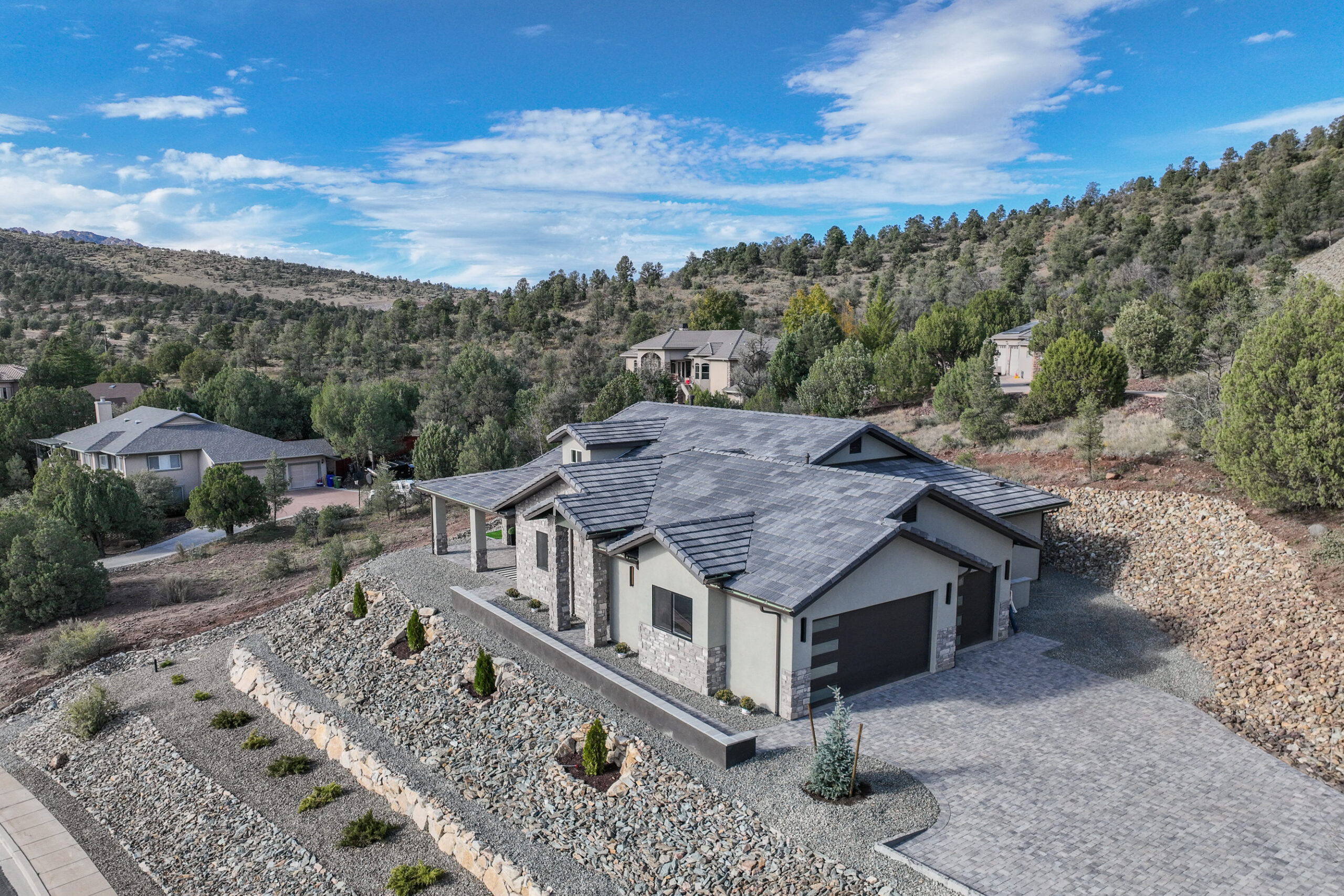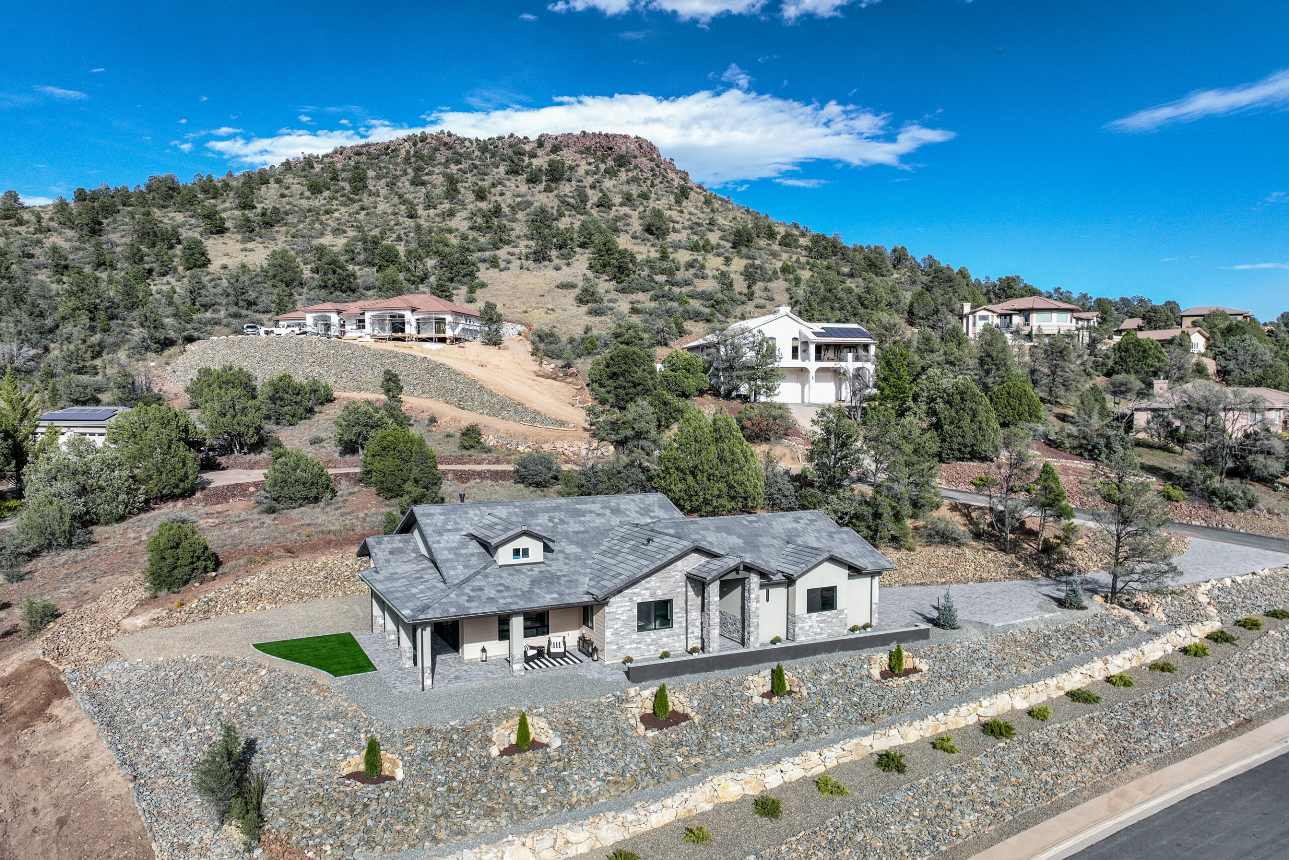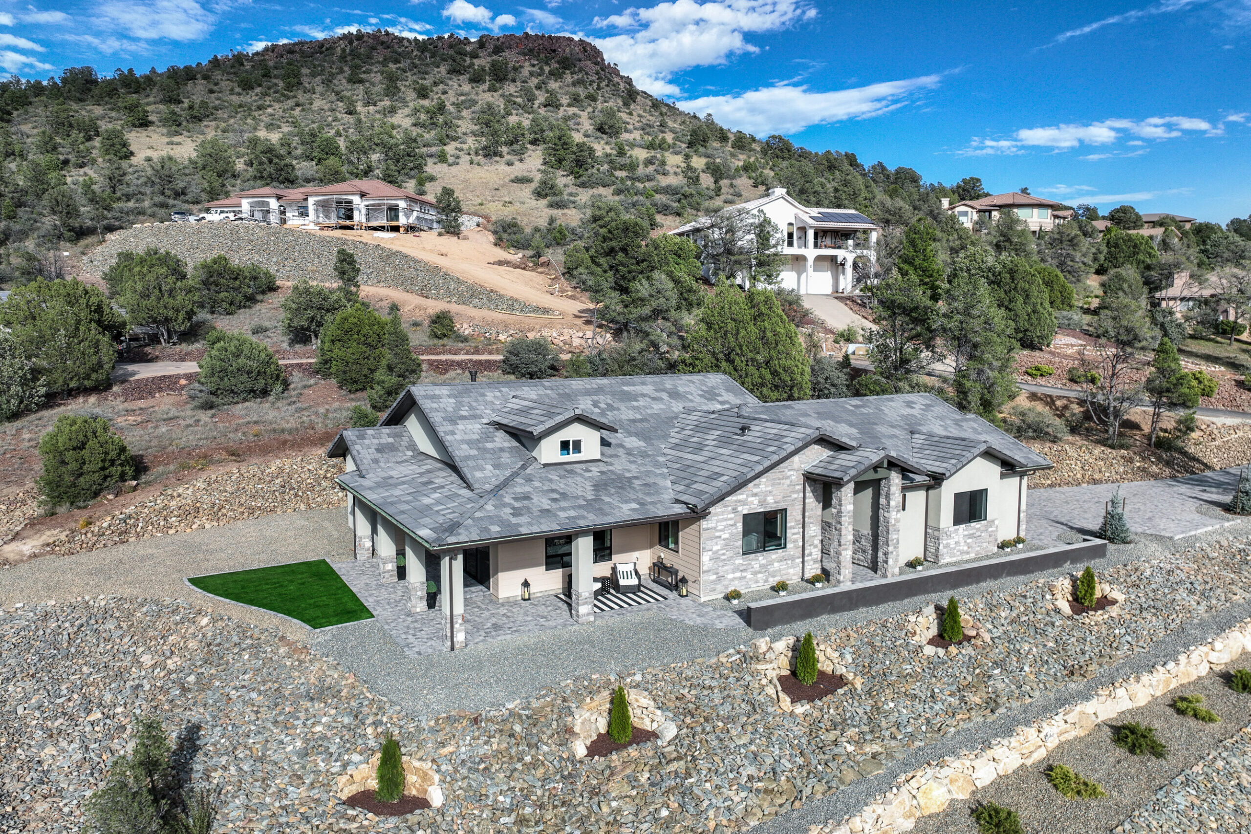 ”NEW” Custom Modern Ranch with Sweeping 180 views of Thumb Butte & Granite Mountain range. Perched on a knoll with a level paver driveway. Designed for today’s lifestyle, home features an open, spacious great room concept w/ luxury chef’s kitchen showcasing quartz countertops, large island, gas cooktop, ss appliances & modern lighting throughout. Interior highlights include lvp & stone flooring, designer fireplace wall with black-faced 24” x 48” tiles, & luxurious primary suite, walk-in shower, garden tub & dual vanities. From sleek hardware to the modern fixtures–reflects refined craftsmanship & contemporary style. Enjoy outdoor living on the surrounding covered patio while taking in breathtaking views, w/ low-maintenance artificial turf & 3 car garage.