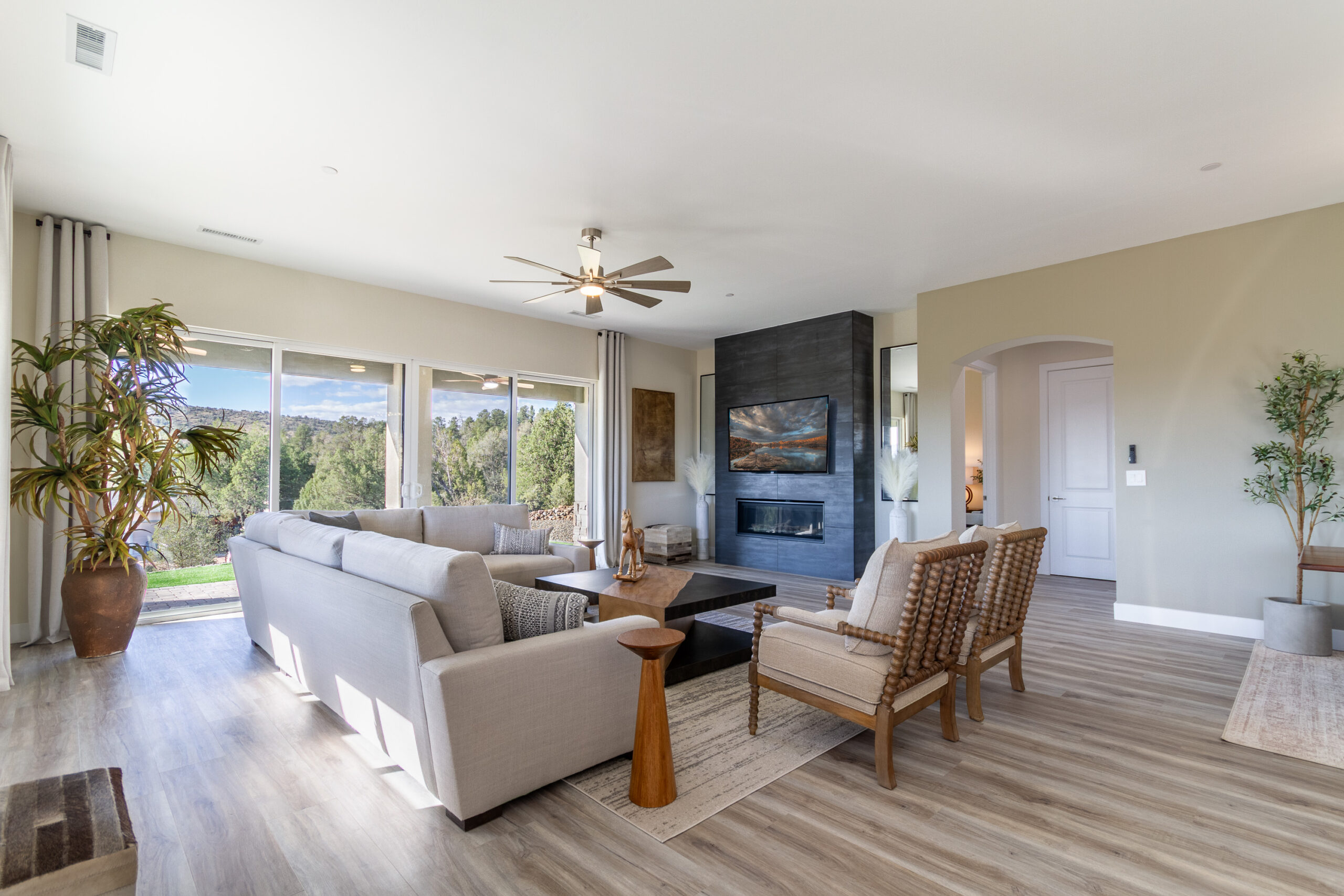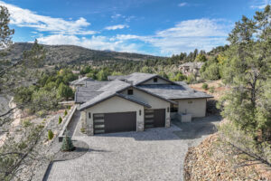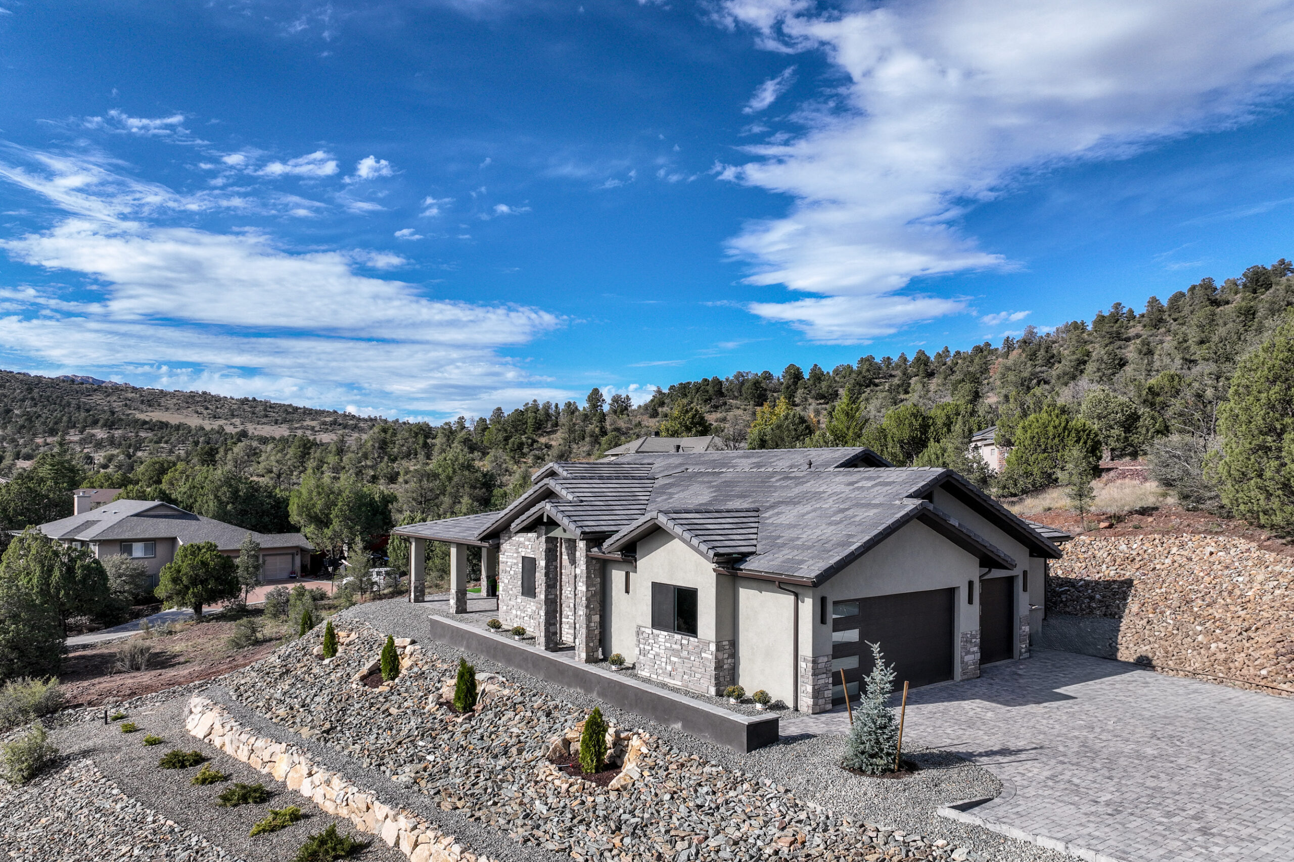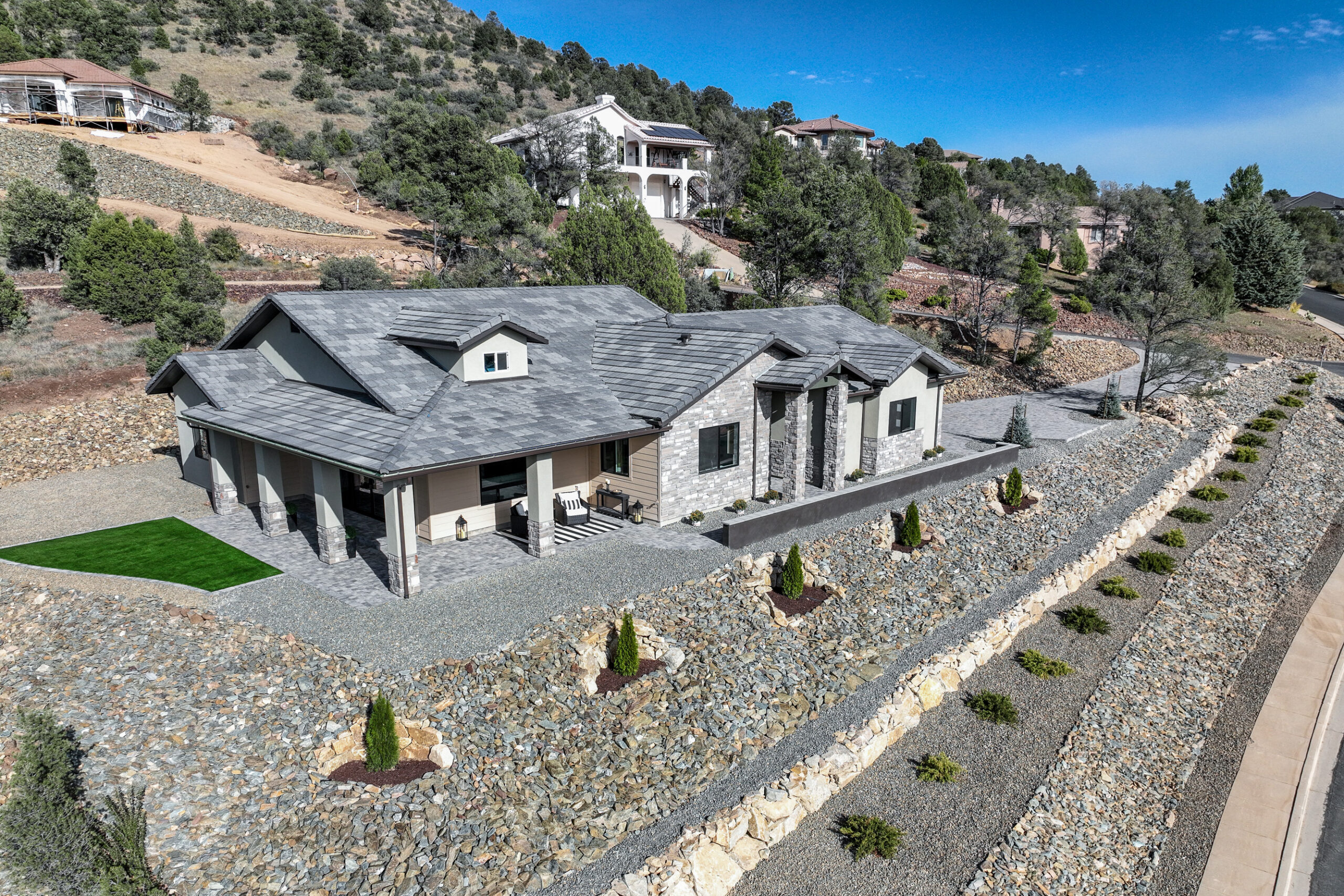 ”NEW” Custom Modern Ranch with Sweeping 180 views of Thumb Butte & Granite Mountain range. Perched on a knoll with a level paver driveway. Designed for today’s lifestyle, home features an open, spacious great room concept w/ luxury chef’s kitchen showcasing quartz countertops, large island, gas cooktop, ss appliances & modern lighting throughout. Interior highlights include lvp & stone flooring, designer fireplace wall with black-faced 24” x 48” tiles, & luxurious primary suite, walk-in shower, garden tub & dual vanities. From sleek hardware to the modern fixtures–reflects refined craftsmanship & contemporary style. Enjoy outdoor living on the surrounding covered patio while taking in breathtaking views, w/ low-maintenance artificial turf & 3 car garage.